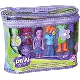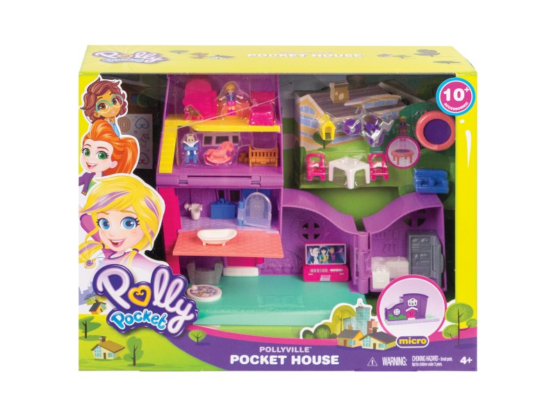 Includes Pollyville Pocket House, micro Polly and Paxton Pocket dolls, Peaches the dog, trampoline, bike and accessories.